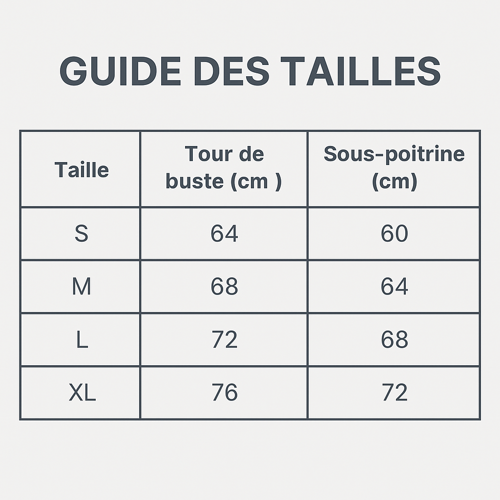 Pour garantir un ajustement parfait, nous vous recommandons fortement de consulter notre Guide des Tailles détaillé disponible sur la page du produit. Il inclut un tableau de conversion basé sur vos mesures de tour de poitrine et de sous-poitrine, pour vous aider à trouver l'équivalent parfait de votre taille habituelle. Et n'oubliez pas : si l'ajustement n'est pas idéal, les retours sont faciles et gratuits !
